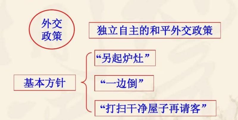 新中国成立之初采取了三大外交方针,即另起炉灶”“打扫干净屋子再请客”“一边倒。这是随着人民革命的节节胜利而在实践中逐步形成的。