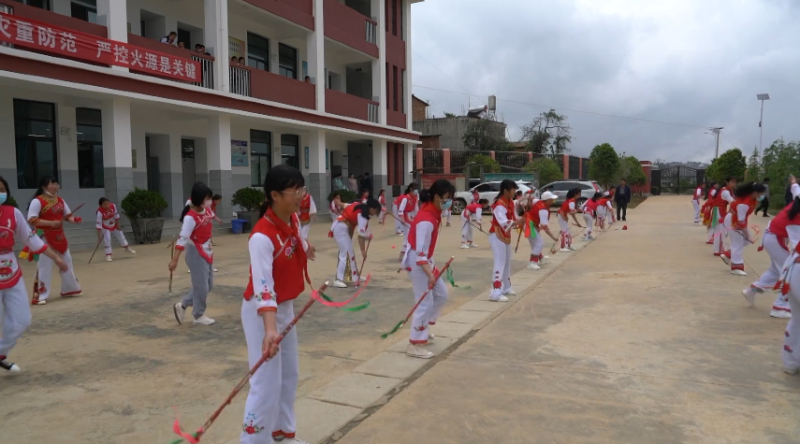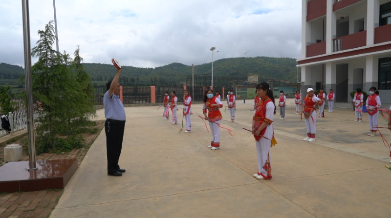 由于学校没有专业的跳霸王鞭舞蹈的老师,常德亮就亲自上阵,根据音乐,把霸王鞭舞蹈的动作排练成为一套完整舞蹈教学体系,统一要求学生们学习,并定制了白族服饰和舞蹈用具“霸王鞭”。