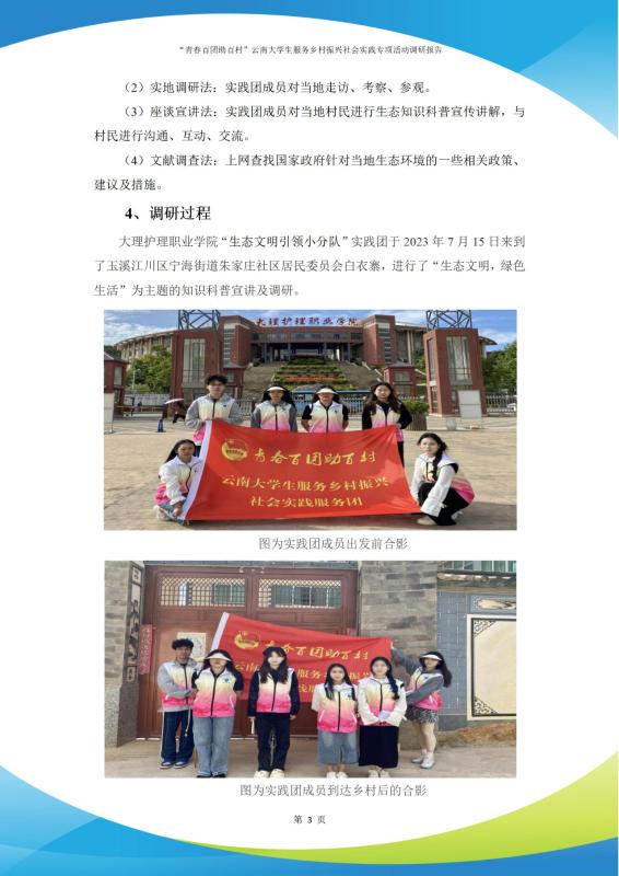 开元生态文明引领实践团队由李文辉、李晓娟、杨春、李心玥、王葶、李学朋6位同学共同组建,于2023年7月15日至25日期间在云南省玉溪市江川区开展了为期10天的“青春百团助百村”服务乡村振兴社会实践活动,切实贯彻落实团中央、团省委关于深化实施“乡村振兴青春行动”的总体部署,深入开展“寻访乡村 关注生态 助力振兴”深度走访实践活动。
