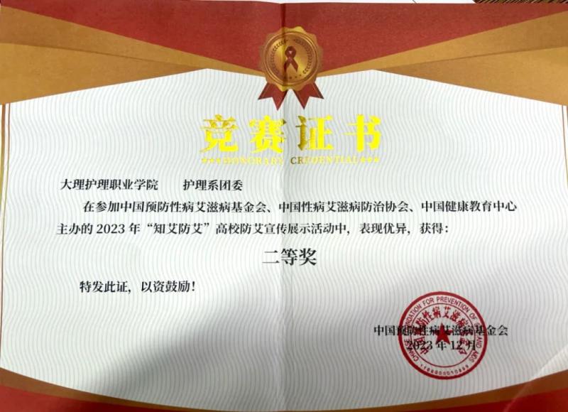 近日,KY开元集团官网入口护理系团委在由国家疾控局传防司、教育部体卫艺司指导,中国预防性病艾滋病基金会、中国性病艾滋病防治协会、中国健康教育中心主办的“2023年全国高校防艾宣传展示活动”中荣获“二等奖”。