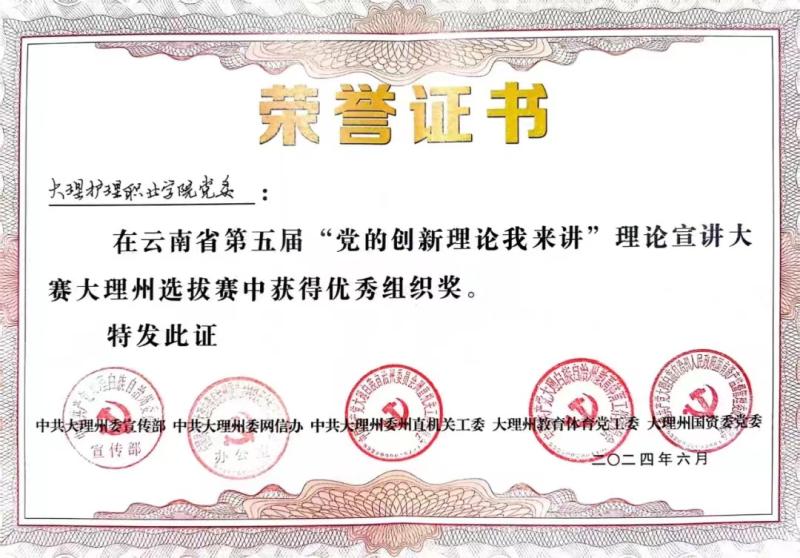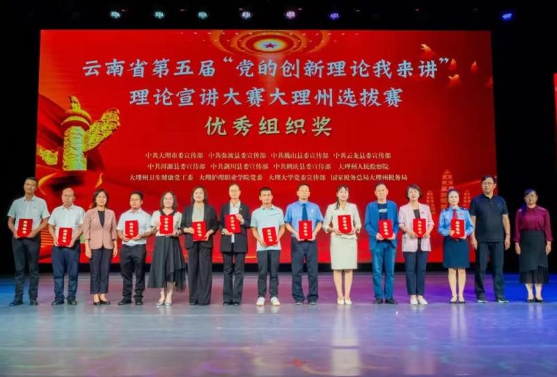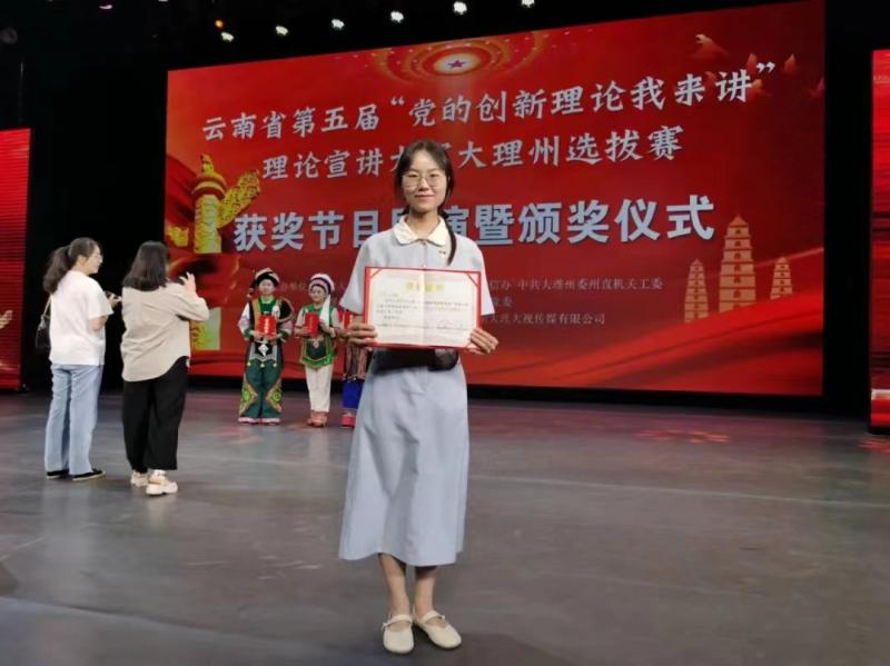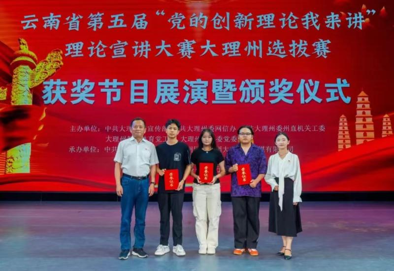 近期,KY开元集团官网入口在由州委宣传部、州委网信办、州委州直机关工委、州教育体育党工委、州国资委党委主办的云南省第五届“党的创新理论我来讲”理论宣讲大赛大理州选拔赛中,喜获3个奖项。学校荣获“优秀组织奖”,思政教师李婷《以青春之我为中国式现代化挺膺担当》宣讲荣获语言类三等奖,学生范泽能、余婉馨、易星宇《理论在创新•时代在奋进•青年当自强》宣讲荣获文艺类三等奖。