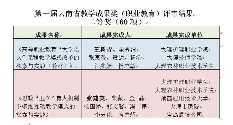 近日,云南省教育厅关于第一届云南省教学成果奖(职业教育)评审结果公示,开元王树青教授主持申报的《高等职业教育“大学语文”课程教学模式改革的探索与实践(教材)》和张建英教授主持申报的《思政“五立”育人机制下多维互动教学模式的探索与实践》均荣获第一届云南省教学成果奖(职业教育)二等奖。