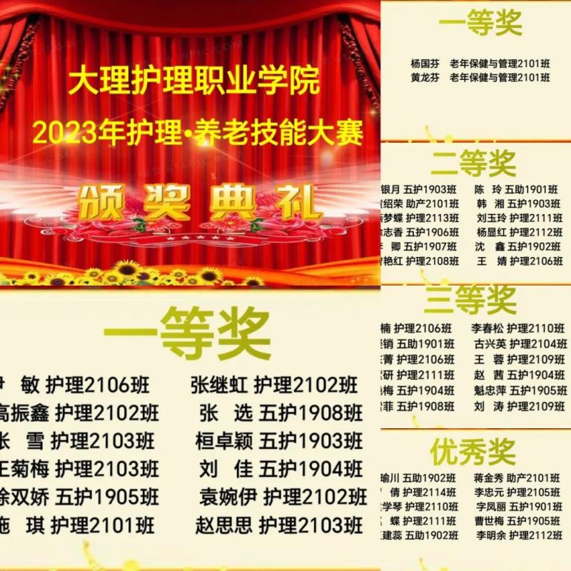 学校领导为2023年护理•养老技能大赛获奖学生颁发奖状,鼓励学生们坚定理想信念,努力成为德智体美劳全面发展的社会主义建设者和接班人。