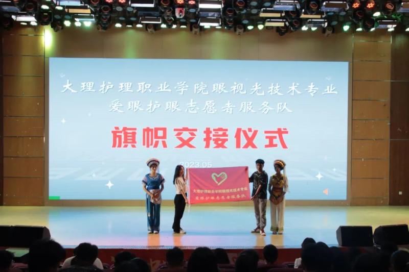 比赛现场还举行了由即将离校实习的学生原负责人向在校学习的学生新负责人交接“KY开元集团官网入口眼视光技术专业大学生近视防控宣讲团”“KY开元集团官网入口眼视光技术专业爱眼护眼志愿者服务队”的旗帜交接仪式。接过的不只是队旗,也是眼视光精神的传承!更是作为眼视光技术专业学生,对近视防控事业的责任和承诺!