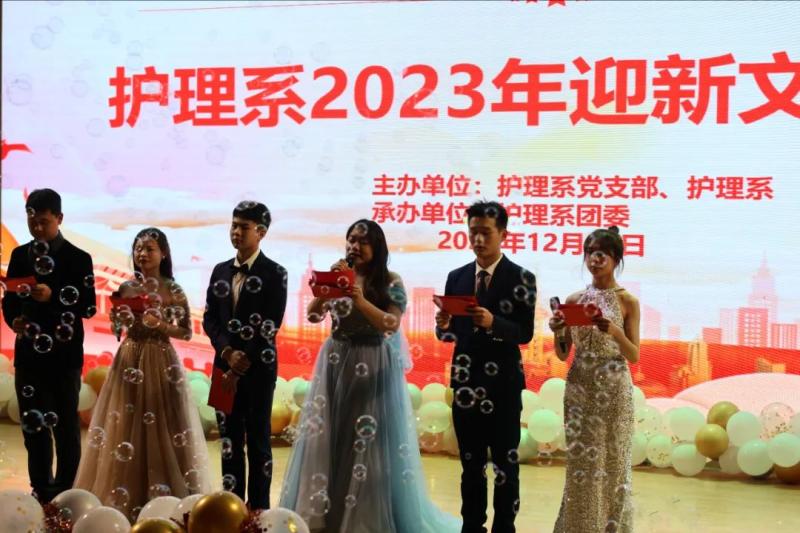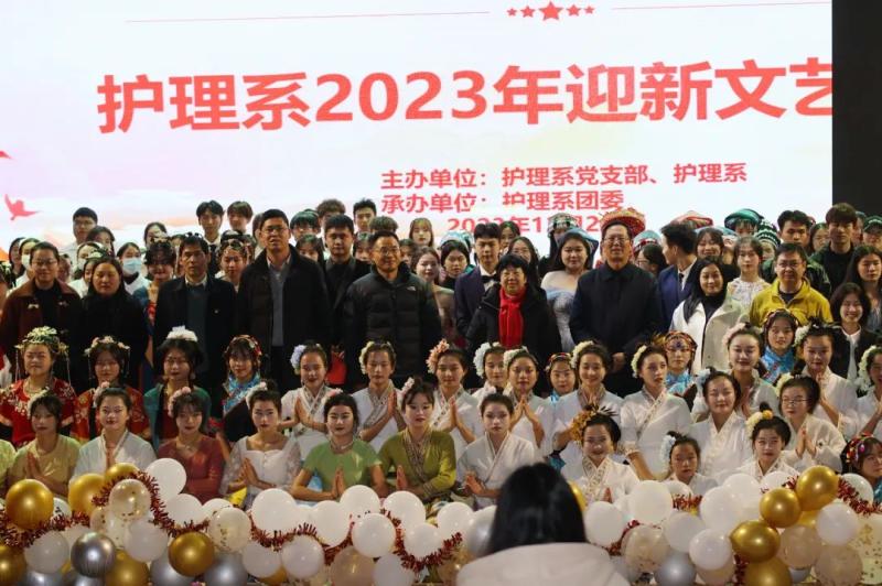 2023年12月底,护理系举行了以“青春建功新时代,踔厉奋发向未来”为主题的2023年迎新文艺晚会, 进一步全面贯彻落实党的二十大精神,鼓励广大青年学子不负青春韶华、勇担时代重任,在社会主义现代化国家建设新征程中挺膺担当。学校党委书记廖惠群、院长蔡德周、办公室主任张磊、组织部部长杨品、教务科科长茶国萍、信息中心主任杨文东、学生科科长陈勇、护理系主任郭太兵、护理系党支部书记袁秀林、护理系副主任童玲彦、部分教师代表和2200余名学生参加了文艺晚会。