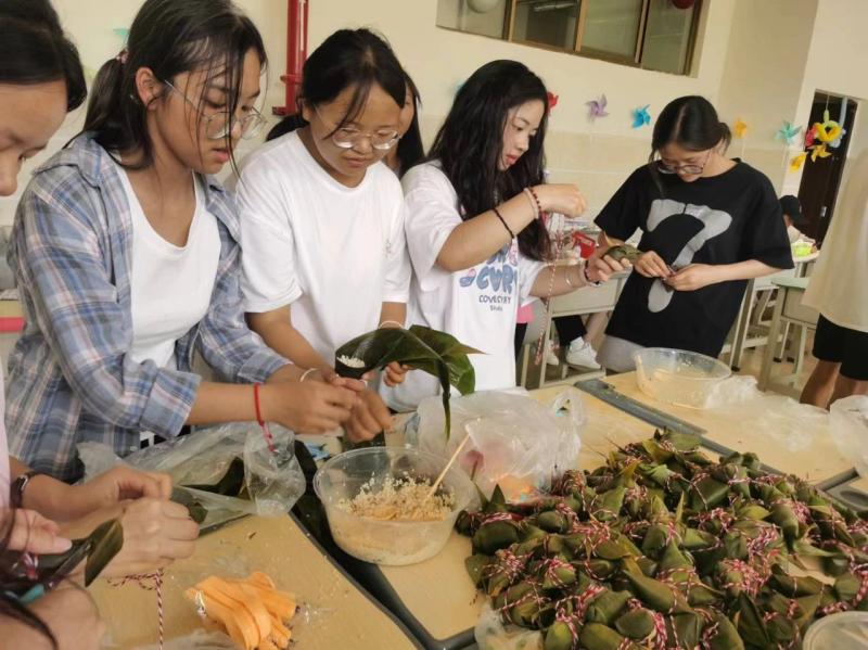 师生们齐心协力、团结协作,一起洗粽叶,淘糯米,切配料,包粽子,体验了粽子制作的全过程。教室里,清新的粽叶飘香四溢,欢笑声此起彼伏。大家还一起编织和佩戴象征喜庆、吉祥的五彩绳,看图猜成语。师生度过了一个温暖、欢乐的端午节,增进了团结,促进友谊,传承中华优秀传统文化,汇聚精神力量。