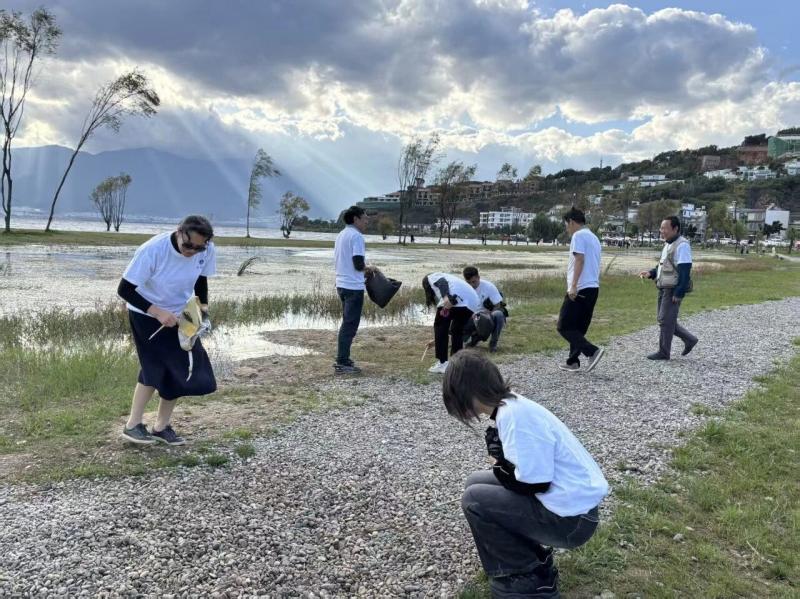 健步走结束后,教职工们迅速转变角色,投入到洱海环保志愿服务中。大家手持垃圾袋、夹子等工具,沿着洱海周边海滩、步道仔细清理各类垃圾,包括塑料瓶、包装袋、烟头等。同时,向过往游客宣传洱海保护的重要性,倡导大家爱护环境,共同守护洱海的碧波。教职工们以实际行动践行环保理念,展现了良好的精神风貌。