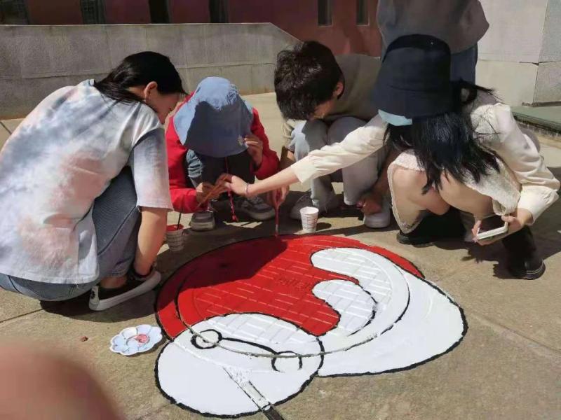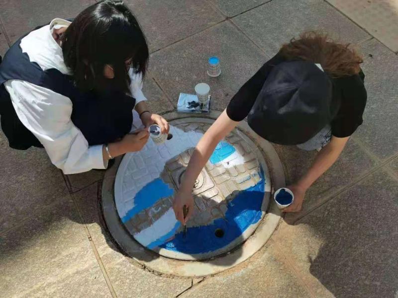 同学们利用课余时间,纷纷走出教室,拿起画笔,发挥天马行空的想象力,用巧妙的创意和艺术构思妙笔生花,在原本不起眼的井盖上描绘出她们内心对校园浓浓的眷恋和情怀,她们用自己的行动来增添校园的美丽。