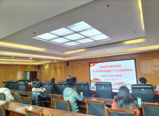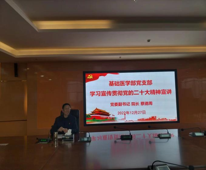 蔡德周院长以《认真学习贯彻二十大报告精神,凝心聚力为全面建设社会主义现代化国家团结奋进》为题。围绕党的二十大主题、过去5年工作、新时代10年伟大变革的重大意义、三个务必、五个必由之路、马克思主义中国化时代化的主要特征、中国式现代化、全面建设社会主义现代化国家的目标任务、坚持党的全面领导和全面从严治党等内容进行宣讲。他紧密结合学校发展实际,并就基础医学部党支部及系部如何学习宣传贯彻好党的二十大精神提出要求。