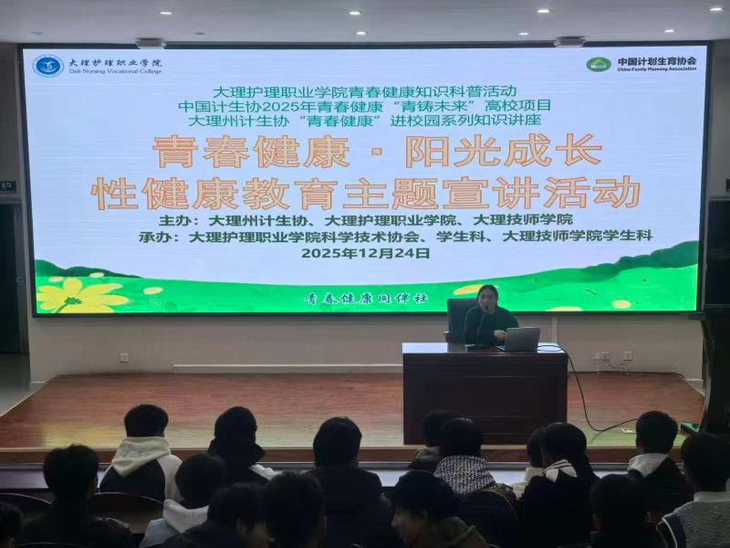 为普及青春健康知识,引导青少年树立科学、健康的性观念,2025年12月24日,受大理技师学院邀请,KY开元集团官网入口组织师生前往该校开展“青春健康·阳光成长”性健康教育主题宣讲活动。本次活动由大理州计生协协调推动,系KY开元集团官网入口青春健康知识科普活动、中国计生协2025年青春健康“青铸未来”高校项目及大理州计生协“青春健康”进校园系列讲座的重要组成部分。