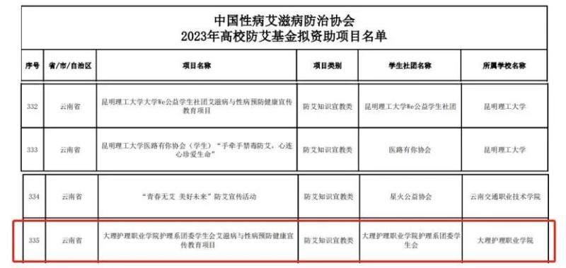 近日,中国性病艾滋病防治协会公布了2023年高校防艾基金申请项目入选名单,开元李渊老师为项目负责人,郭太兵、袁秀林、茶国萍、金旭老师为项目组成员,指导护理系团委、学生会申报的《艾滋病与性病预防健康宣传教育项目》首次成功入选立项。