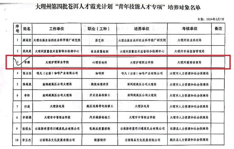 根据《中共大理州委办公室 大理州人民政府办公室关于实施苍洱人才“霞光计划”推动新时代大理高质量可持续发展的意见》、《大理州“苍洱霞光”人才评审认定暂行办法》和《苍洱人才霞光计划“青年技能人才培养专项”实施细则》的要求,经个人申报、单位推荐、专家评审等程序,开元李渊老师入选2024年度大理州第四批苍洱人才霞光计划“青年技能人才专项”培养对象。