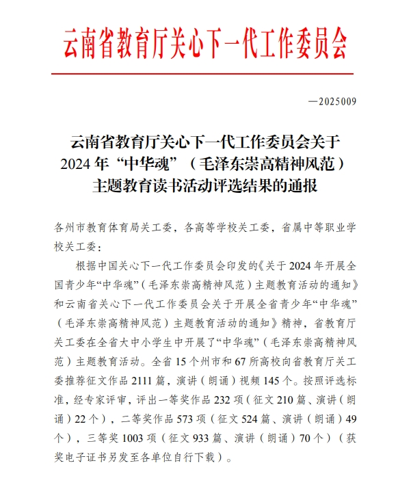 近日,云南省教育厅关心下一代工作委员会公布2024年“中华魂”(毛泽东崇高精神风范)主题教育读书活动评选结果,开元选送征文作品荣获4项三等奖。