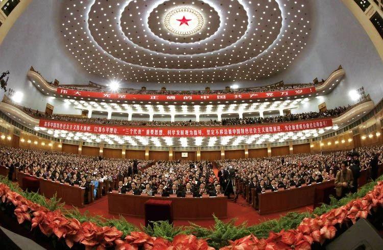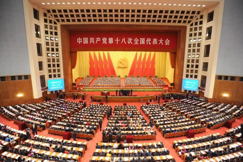 人民大会堂雄伟庄严,万人大礼堂气氛热烈。主席台上方悬挂着“中国共产党第十八次全国代表大会”的会标,后幕正中是镰刀和锤头组成的党徽,10面鲜艳的红旗分列两侧。二楼和三楼的眺台上分别悬挂着“高举中国特色社会主义伟大旗帜,以邓小平理论、‘三个代表’重要思想、科学发展观为指导,坚定不移沿着中国特色社会主义道路前进,为全面建成小康社会而奋斗!”“伟大、光荣、正确的中国共产党万岁!”的横幅。