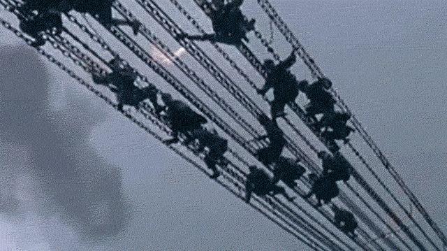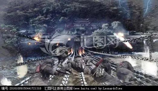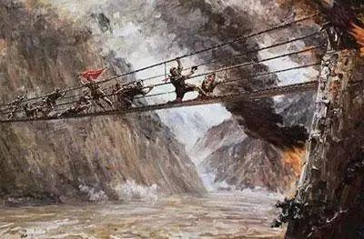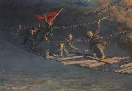 泸定桥离水面有好几丈高,是由13根铁链组成的:两边各有两根,算是桥栏;底下并排9根,铺上木板,就是桥面。现在连木板也被敌人抽掉了,只剩下铁链。向桥下一看,真叫人心惊胆寒,号手们吹起冲锋号,所有武器一齐开火,枪炮声,喊杀声,霎时间震动山谷。二连担任突击队,22位英雄拿着短枪,背着马刀,带着手榴弹,冒着敌人密集的枪弹,攀着铁链向对岸冲去。跟在他们后面的是三连,战士们除了武器,每人带一块木板,一边前进一边铺桥。