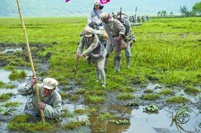 还有宿营难。草地净是泥泞渍水,一般很难夜宿。行军到了傍晚,往往要找一个土丘、河边、高地,比较干一点的地方宿营。如果找不到比较干一点的地方,就只好在草地里露宿。怎么露宿?或者就地而卧,或者坐着打盹,或者背靠背睡一会。