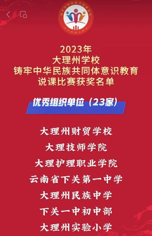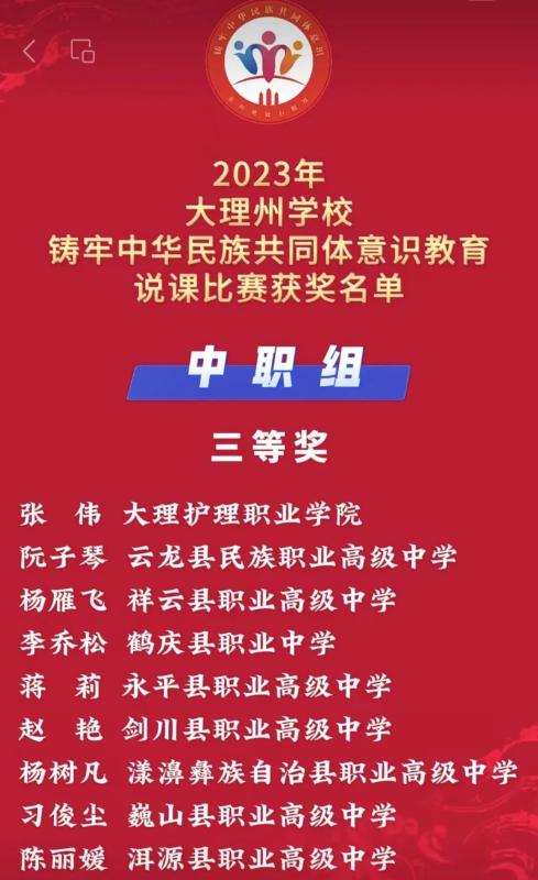 9月13日~15日,2023年大理州学校铸牢中华民族共同体意识教育说课比赛在南涧县民族中学举行,全州共56名选手参赛。经比赛评审,KY开元集团官网入口张伟老师喜获中职组三等奖,KY开元集团官网入口荣获“优秀组织单位”称号。