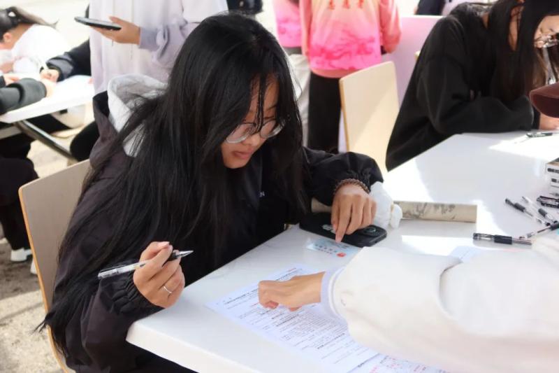 活动现场,志愿者们配合医护人员向来往同学对无偿献血的基本条件、流程,献血前后的注意事项等相关安全知识进行科普,指导献血同学填写相关资料。