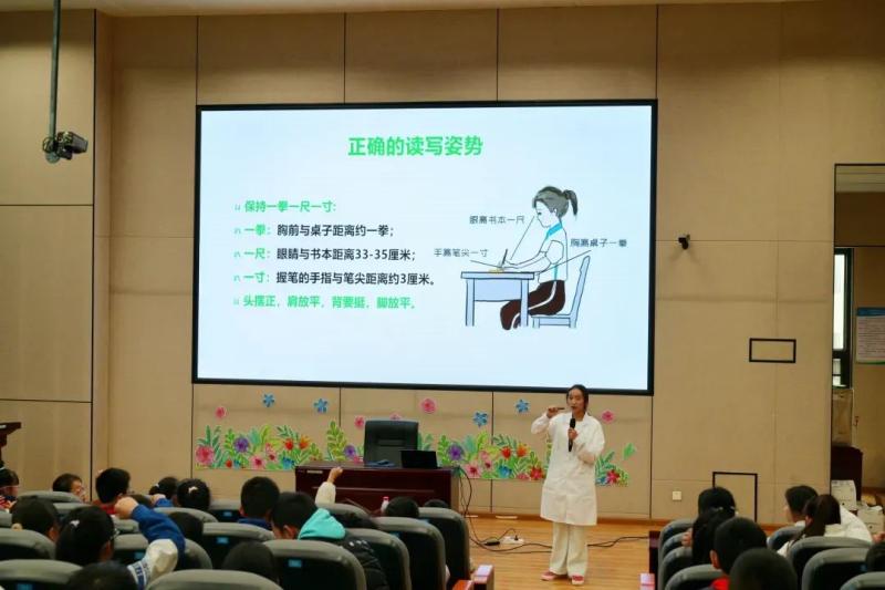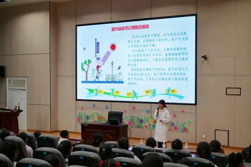 宣讲活动结合小学阶段学生近视防控特点,用简单生动的宣讲方式,力求使小朋友现学现懂,内化于行、自律依从、持之以恒,宣讲以小合唱《光明的未来》开场,现场气氛瞬间活跃起来,随后依次进行了“儿童青少年使用电子产品要求”、“增加户外活动能够有效预防近视”、“正确坐姿、握笔姿势及20-20-20护眼法则”、“健康饮食、平衡饮食”四个方面的宣讲,最后以一首小合唱《你是我的眼》圆满收场。整个宣讲活动内容接地气、语言活泼、互动有序,使小朋友们认识到了自身就是“自己视觉健康第一责任人”意识,宣讲活动达到了预期效果。