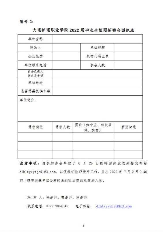 2.请按附件2认真填写的《KY开元集团官网入口2022届毕业生招聘单位回执表》并于2022年6月26日前将回执以电子邮件形式发送至dlhlzyxyzjc@163.com,以便我们安排展位。