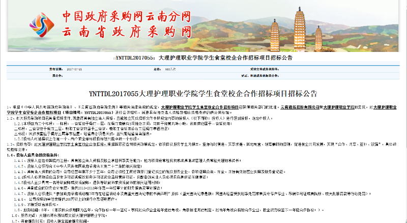KY开元集团官网入口学生食堂校企合作招标项目(YNTTDL2017055)招标公告于2017年7月21日在中国政府采购网、云南省政府采购网发布招标公告。