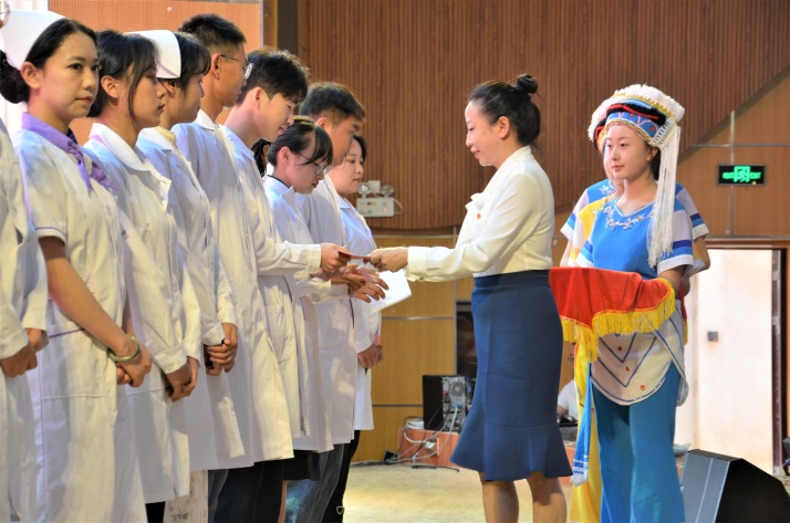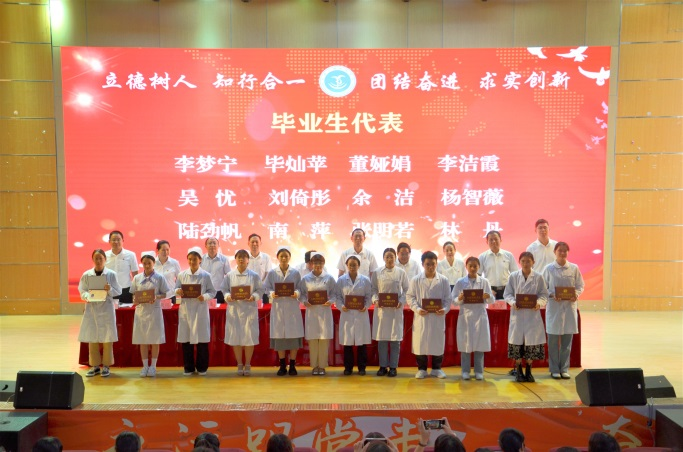 张雯红同学回顾了三年学习生活历程,对学校和老师三年的培育和教导表示感谢。她代表全体毕业生誓言:“以救死扶伤为信仰,以科学研究为追求,以公众健康为使命,努力成为一名优秀的医学健康守卫者而奋斗。”