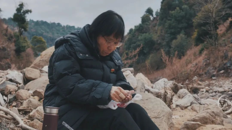 张桂梅在家访的路上吃药。(图片来源:新华社)