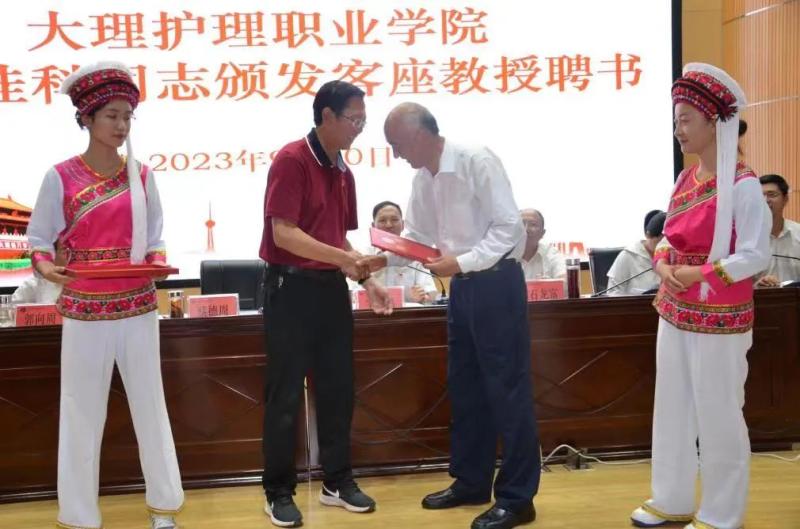学校聘请李桂科医生为“客座教授”,蔡德周院长为李桂科医生颁发“客座教授”骋书。