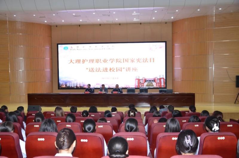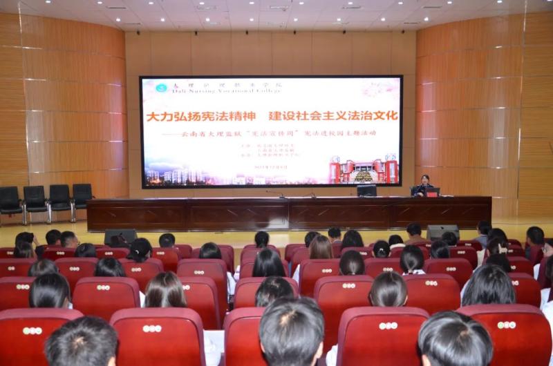 12月4日,在第十个国家宪法日,KY开元集团官网入口联合共青团大理州委和云南省大理监狱在学校第二报告厅开展主题为“大力弘扬宪法精神 建设社会主义法治文化”的“宪法宣传周 宪法进校园”主题活动。大理监狱政治处副主任李泽龙、警官李丹婷、学校教职员工和学生代表258人参加活动。学校党委专职副书记字利鹏主持活动。