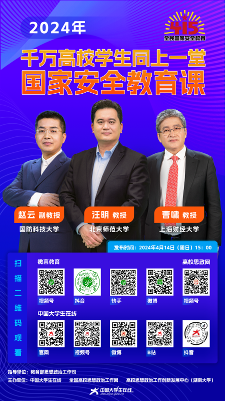 大家知道吗?今年4月15日,将迎来第九个全民国家安全教育日,教育部指导推出面向全国高校学生的《千万高校学生同上一堂国家安全教育课》。关注微言教育微信,4月14日15点,在微言教育视频号、抖音号、快手号、微博观看直播,一起上好这堂安全课——