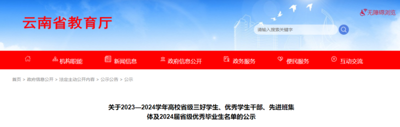 按照《中共云南省委教育工委 云南省教育厅关于开展2023—2024学年省级三好学生 优秀学生干部 先进班集体及2024届优秀毕业生推选工作的通知》精神,经各单位逐级评选、公示、推荐,并经省委教育工委、省教育厅审定及公示,共评选出云南省2023-2024学年高校省级三好学生5074名、优秀学生干部1282名、先进班集体2349个、2024届省级优秀毕业生23004名(具体名单见附件),现予以公布。
