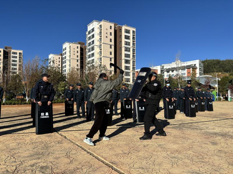 培训现场,海东新区派出所所长作动员讲话,他分析了目前校园面临的反恐形式,强调全体安保人员要以此次反恐防暴培训为契机,警钟长鸣,要不断提升突发事件的应急处置能力。大理市公安局巡特警大队副队长为师生详细讲解了基本的反恐防暴技能和应对方法,对安保人员进行了防暴盾牌、钢叉、应急棍等警械装备使用方法的培训,增强了安保人员、师生对反恐防暴安防技巧的运用能力。