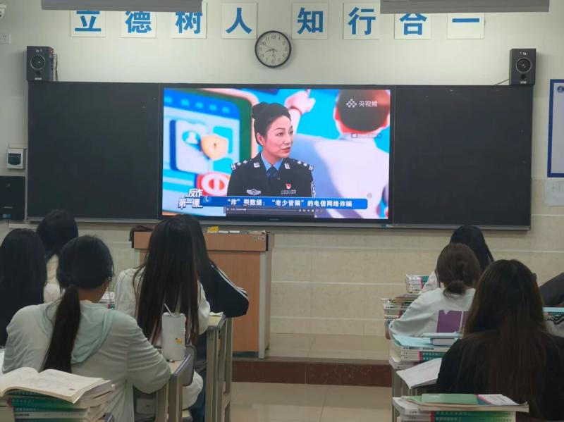 校园电子显示屏滚动播放网络安全宣传标语和短视频,全方位营造浓厚的宣传氛围。校园日当天,各班级按照统一部署开展“网络安全”“反诈”的主题班会。通过观看公安部刑侦局联合央视频开展的线上直播“反诈第一课”,让学生对当前新型诈骗手段有更全面地认识与了解,直观感受网络安全的重要性;组织学习《中华人民共和国网络安全法》《中华人民共和国数据安全法》《中华人民共和国个人信息保护法》等网络安全领域重要法律法规。