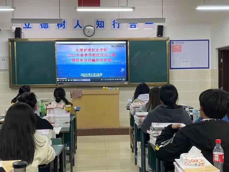 2月28日,为进一步加强校园安全和预防电信诈骗宣传教育,建设平安校园,学校开展“开学第一课”,邀请大理市公安局海东新区派出所所长刘硕警官,为全校师生开展线上校园安全暨防范电信诈骗知识讲座。全体在校班级学生通过各班教室多媒体认真聆听了讲座。