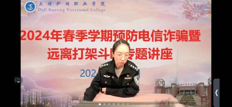 4月6日,学校邀请大理市公安局海东新区派出所副所长汤绍怡警官,为全校师生开展了“预防电信诈骗暨远离打架斗殴”的专题讲座,进一步抓牢校园安全和学生法治教育,扎实推进平安校园和法治校园建设,全体在校班级近3600名学生通过各班教室多媒体认真聆听了此次讲座,讲座由学生科负责人陈勇老师主持。