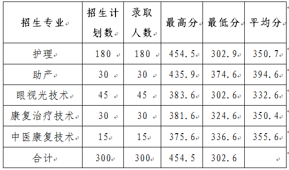 2017年8月1日KY开元集团官网入口高职专科“三校生”类300人录取全部结束,最高分454.5分,最低分302.9分,其中护理专业最低分302.9分,超控制线197.9分;助产专业最低分374.6,超控制线269.6分;眼视光技术专业最低分302.6分,超控制线107.6分;康复治疗技术最低分324.6分,超控制线129.6分;中医康复技术最低分336.6分,超控制线141.6分。录取结果为: