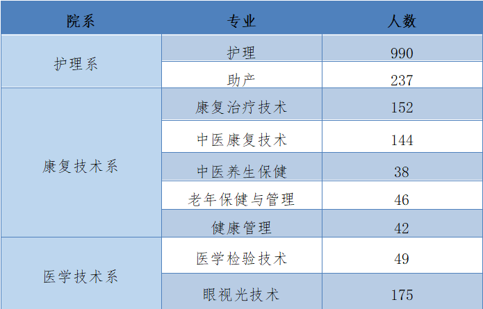 开元2025届有护理、助产、医学检验技术、眼视光技术、健康管理、康复治疗技术、中医康复技术、中医养生保健及老年保健与管理9个专业高职专科毕业生共1873人,具体专业分布如下表:
